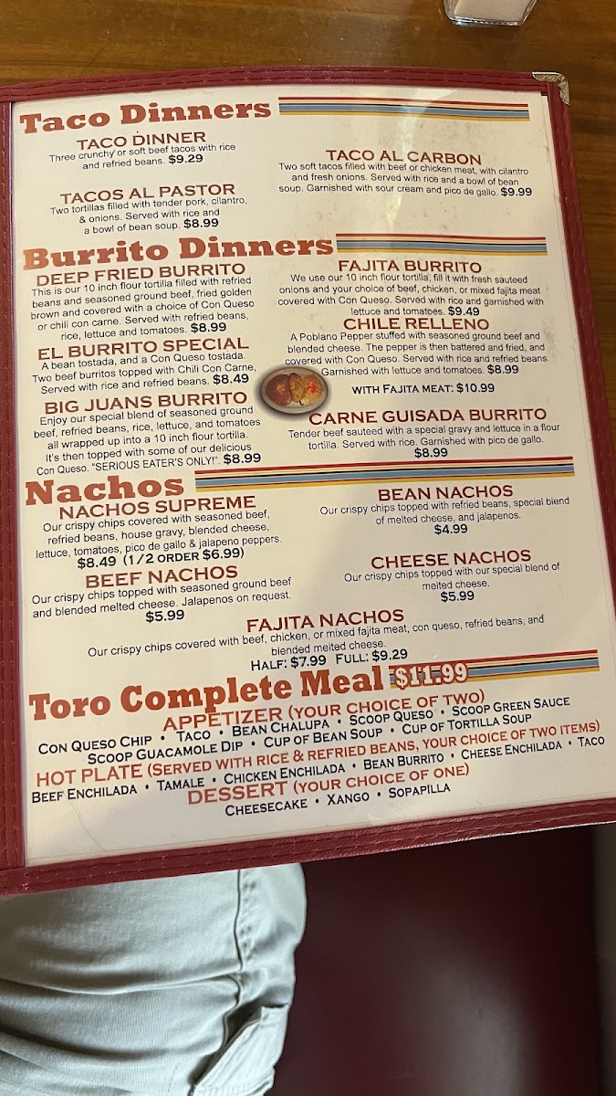 The real stars here are the well-crafted burritos, tacos, and traditional dishes like Al Pastor and Carne Guisada, praised by diners for authenticity and freshness. Don't miss the tempting basket of warm sopapillas or the unique Toro Dessert to round off your visit on a sweet note. With fast service, reasonable prices, and heartfelt hospitality, Señor Toros delivers an inviting, no-fuss dining experience that captures the spirit of Tex-Mex cuisine perfectly.