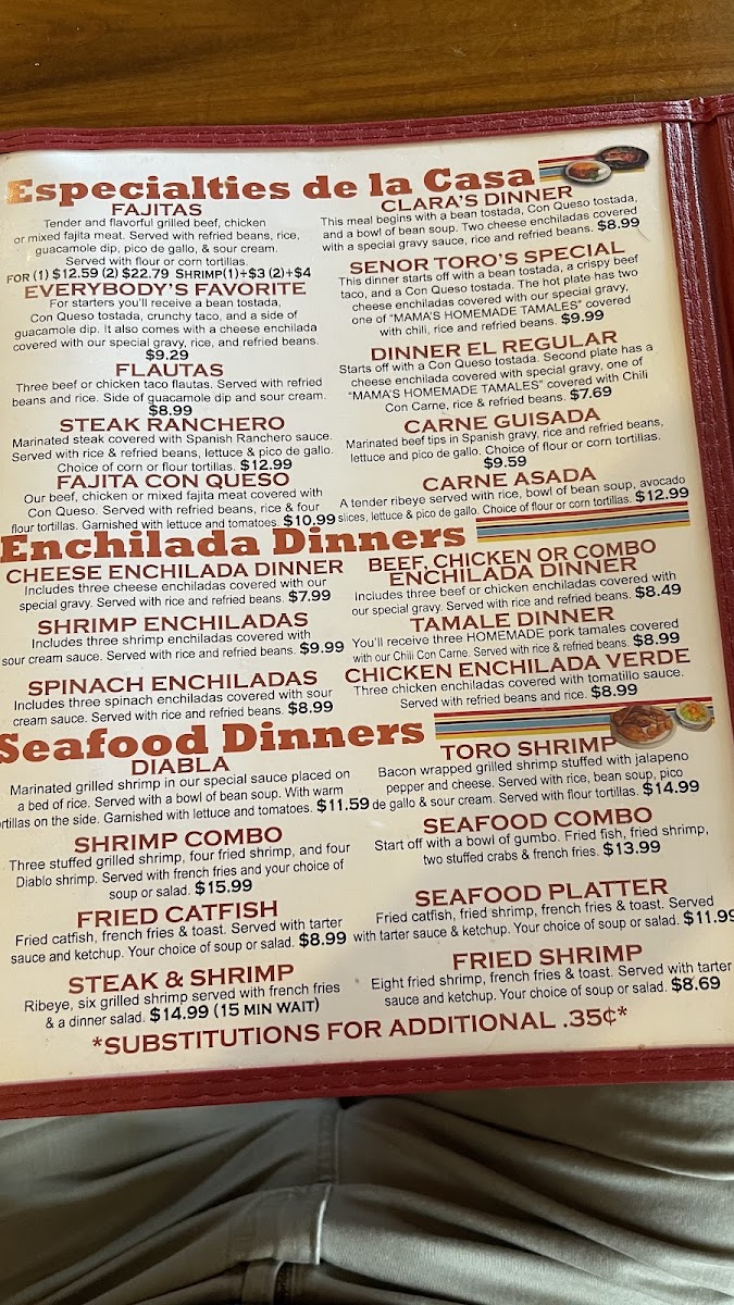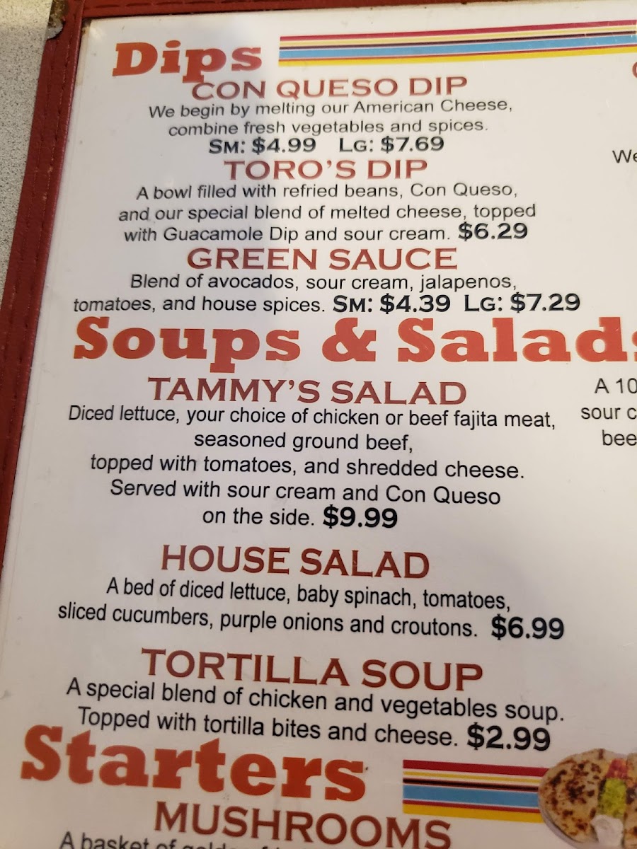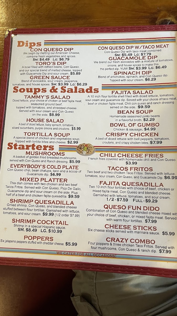 Señor Toros in Woodville, TX, stands out as a beacon of authentic Tex-Mex and Mexican flavors. The menu brilliantly balances classic dishes with bold, fresh tastes. Start your meal with their standout Con Queso and Toro's Dips, ideal for sharing and setting the tone for true Mexican indulgence. For starters, their seasoned mushrooms offer a simple yet flavorful bite that complements the rich main courses.